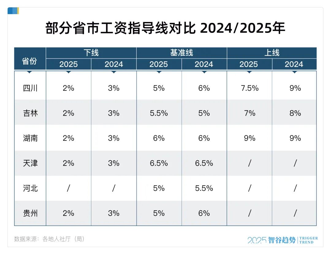 近期,天津、河北、山西、吉林、四川等省市都公布了2025年企业工资指导线,基准线都超过了5%(今年的GDP增速就是5%)。