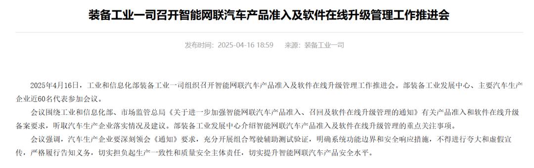 2025年4月,工信部组织召开的智能网联汽车产品准入及软件在线升级管理工作推进会,标志着行业强监管时代的来临。