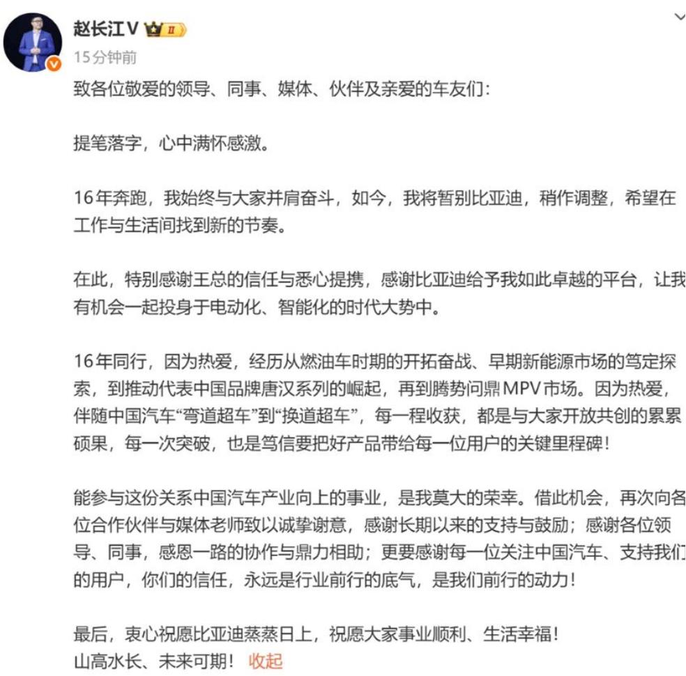 微博发文中,赵长江细致回顾了在比亚迪的16年历程,几乎涵盖了比亚迪的整个发家史: