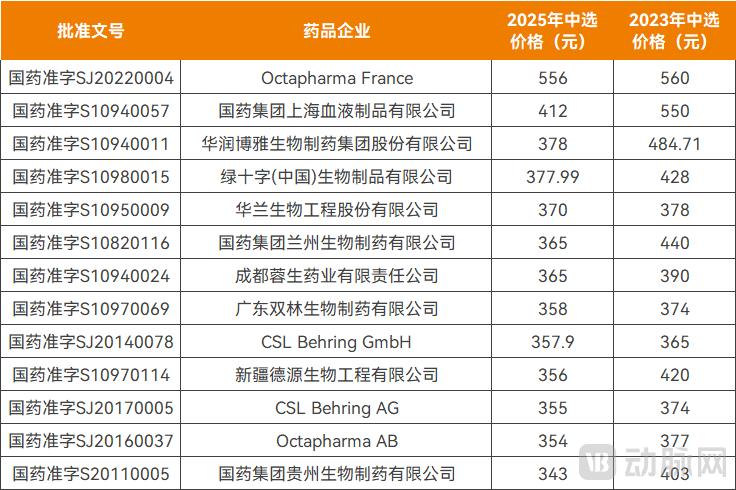 以2025年9月公布接续中选结果的京津冀“3+N”联盟集采为例,本次集采共有超50个人血白蛋白产品入选,包括12.5g、10g、5g、2g几个规格,其中10g规格最低价格已到337元/瓶。与该联盟地区上一轮集采相比(2023年),10g标准规格产品中,有13个产品价格下降,最高降幅达25%。