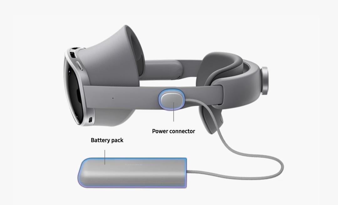 Galaxy XR 采用了与 Vision Pro 近似的产品形态,将前部的眼罩作为硬件主体,后部完全依靠头带固定。为了最大限度降低头显主题重量,电池包只能外置、拖线: