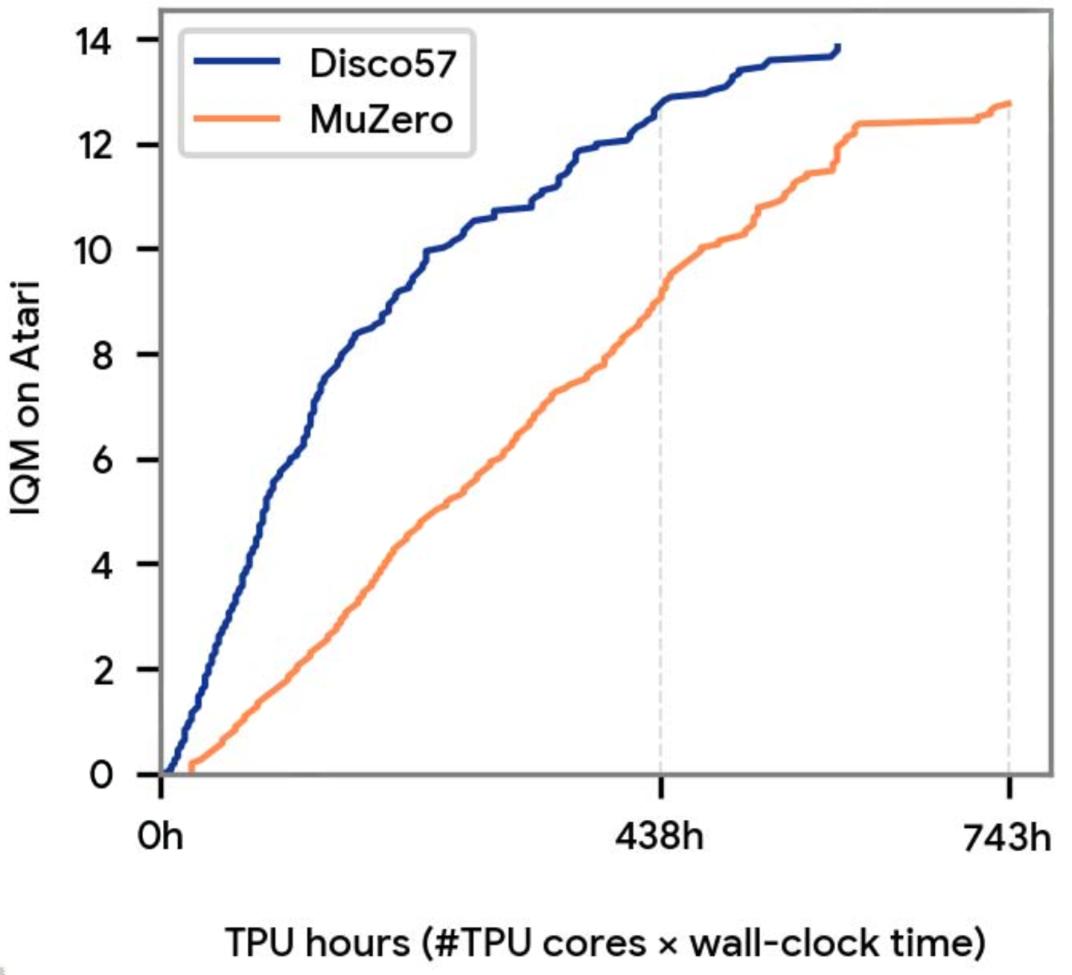 与比赛中排名靠前的提交智能体不同,Disco57 没有使用任何领域特定知识来定义子任务或进行奖励塑造 (reward shaping)。为了进行公平比较,该团队使用与 Disco57 相同的设置,通过 IMPALA 算法训练了一个智能体。IMPALA 的表现要弱得多,这表明 Disco57 发现了一种比标准方法更高效的 RL 规则。