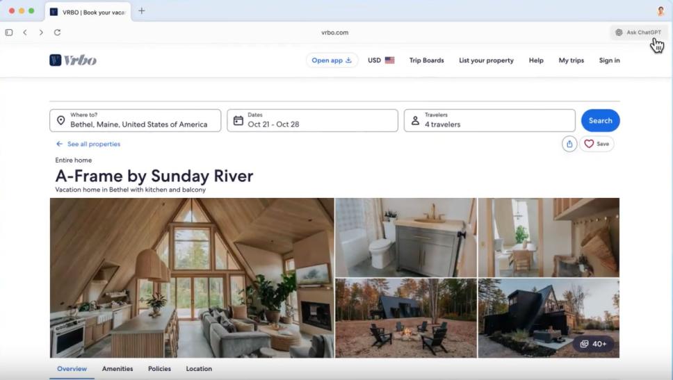 侧边栏设计是 Atlas 的亮点之一。用户点击「Ask ChatGPT」按钮,就能在任意页面右侧打开ChatGPT侧边栏。