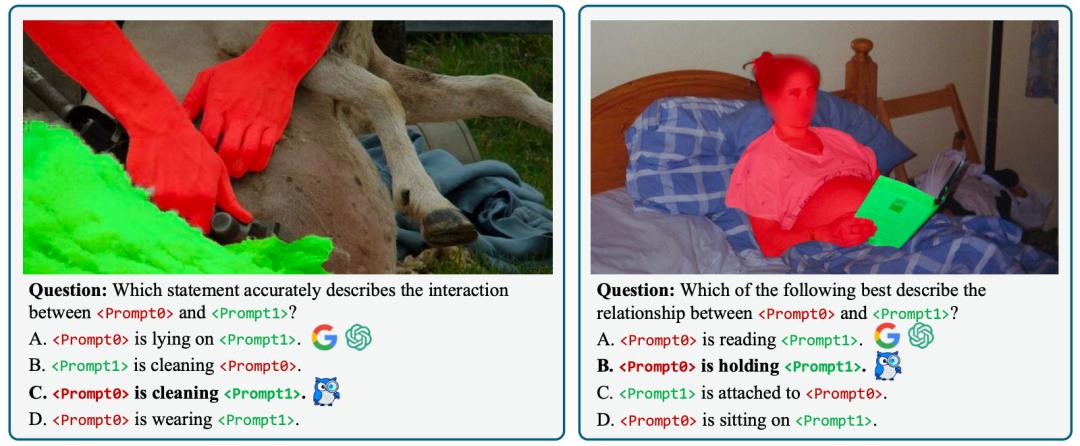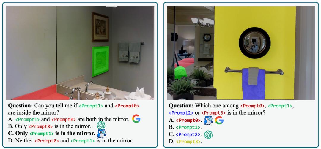 例如,“请描述这个区域”,或“区域1和区域2之间是什么关系”,甚至判断“区域1和区域2是否在镜子当中”。