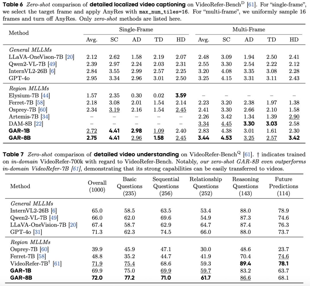 甚至,团队惊喜地发现,GAR的能力可以zero-shot迁移至video。团队直接将GAR模型扩展至视频任务,并分别在VideoRefer-Bench-D与VideoRefer-Bench-Q测试集上进行评估,结果如表6、表7所示。