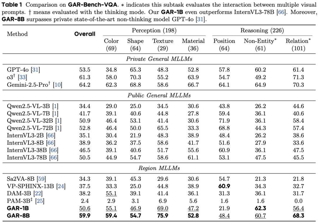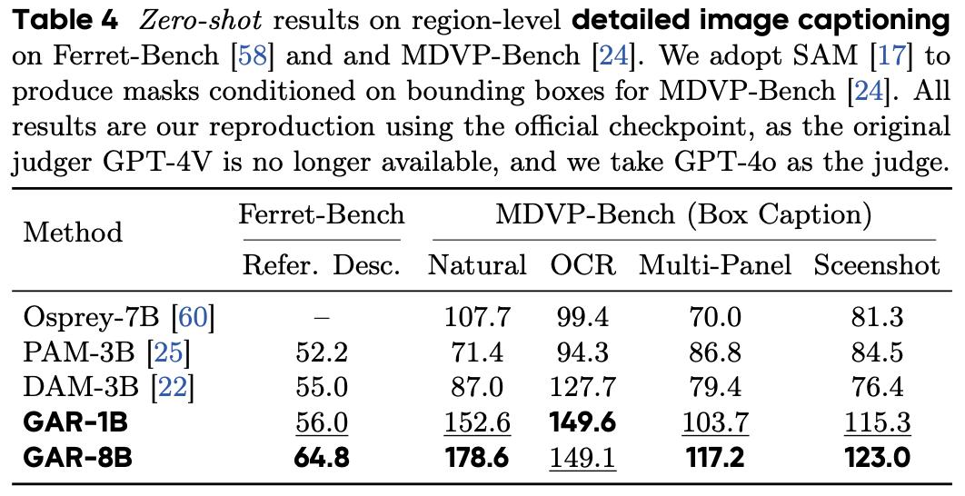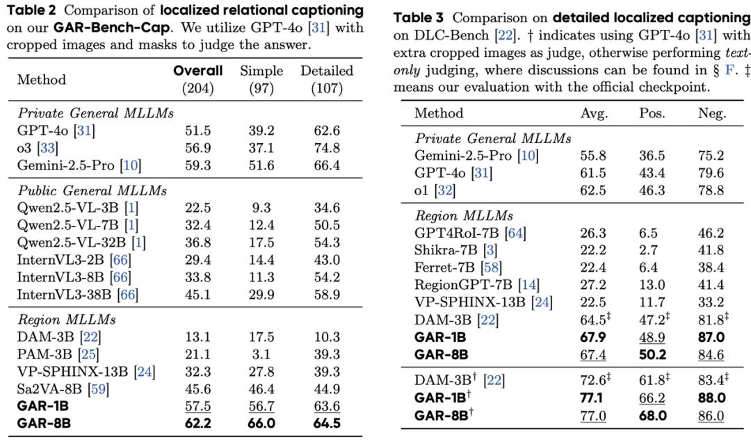 如表2所示,在GAR-Bench-Cap测试集上,GAR-1B与GAR-8B分别取得57.5分和62.2分的最高综合成绩,表现甚至超过Gemini-2.5-Pro等性能强劲的私有模型。