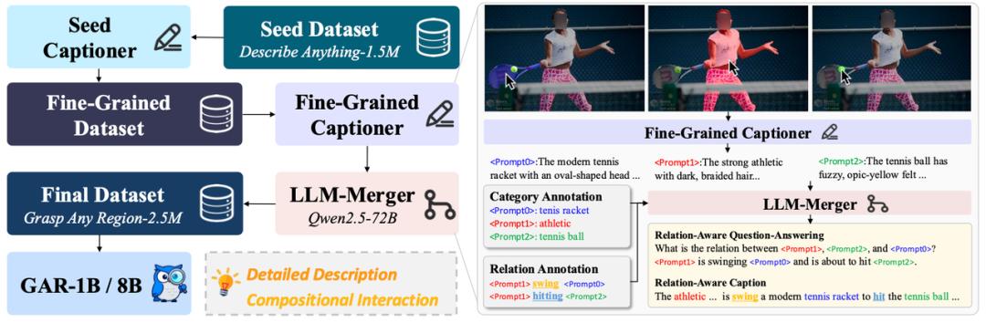 团队先通过Seed-Captioner生成初始region caption,再利用LLM将生成的描述与真实类别标签进行验证,最终得到含456K样本的精细化细粒度数据集。