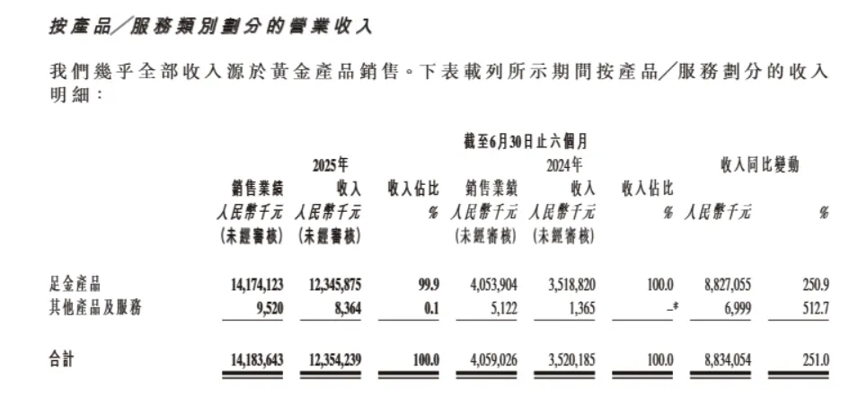 2025年中报数据显示,老铺黄金的主要营收依然来自“足金产品”的销售,这一项收入今年上半年为88.3亿元,同比大涨250.9%,占比总营收的99.9%。