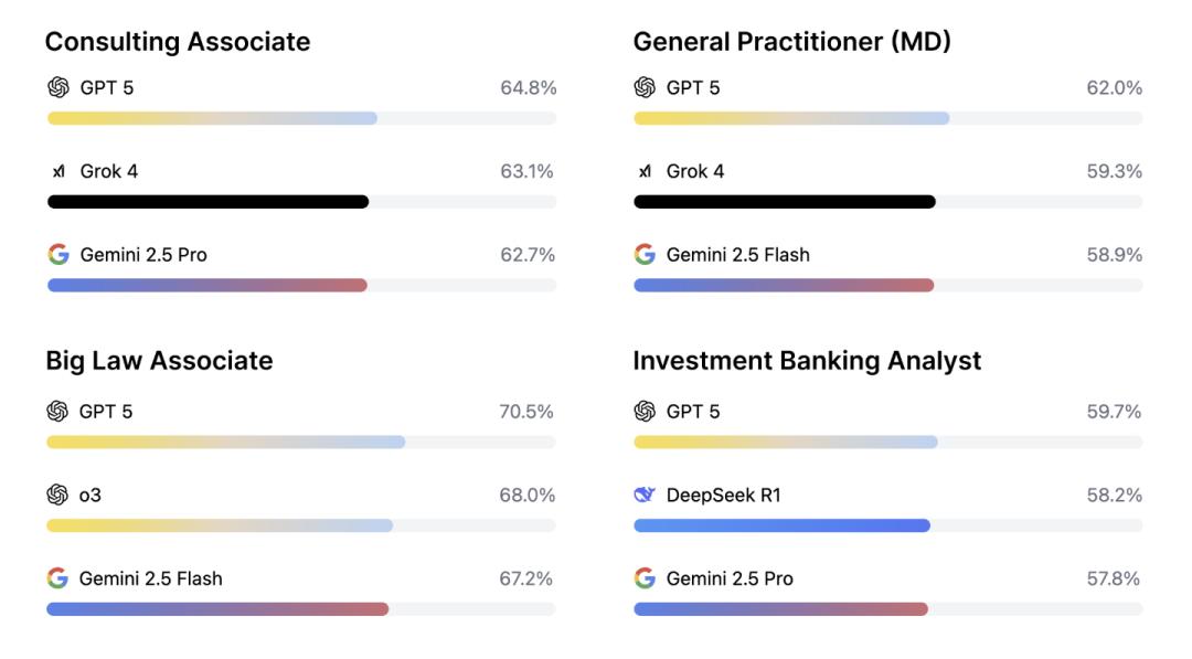 本月初,Mercor官宣了其首创的AI生产力指数(APEX),可以根据AI模型执行具有经济价值的知识工作的能力来评估它们。 目前,APEX包含代表四个职业工作的任务:投资银行助理、大型法律助理、战略咨询助理和全科医生(MD)。