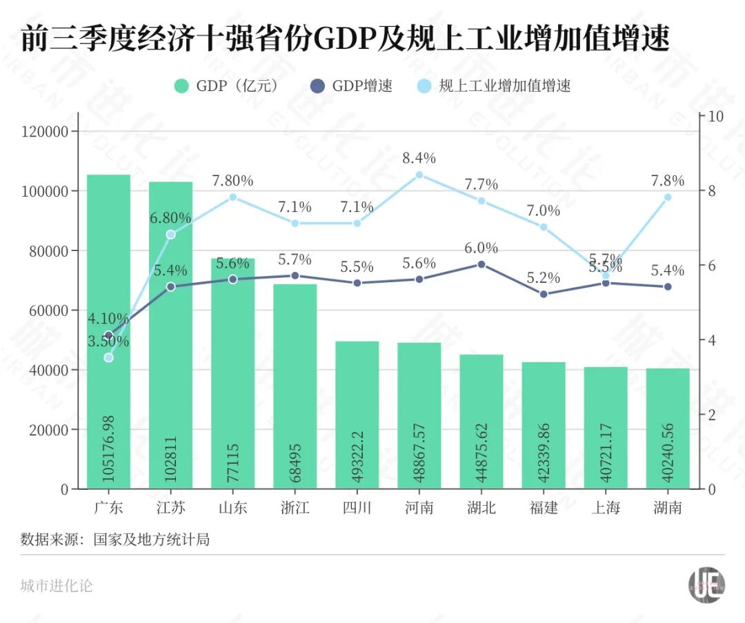 工业大省山东、湖南也在前三季度展现出了强劲增势,同以7.8%的规上工业增速在经济十强省份并列第二。同期,山东、湖南分别实现GDP77115亿元、40240.56亿元,增速分别高于全国0.4个百分点、0.2个百分点。