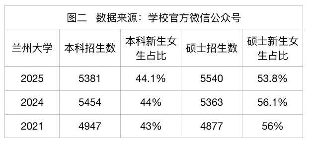 如下图所示(见图2),兰州大学近几年的本科、硕士招生数量十分接近,但硕士研究生新生女生占比持续高于本科阶段。