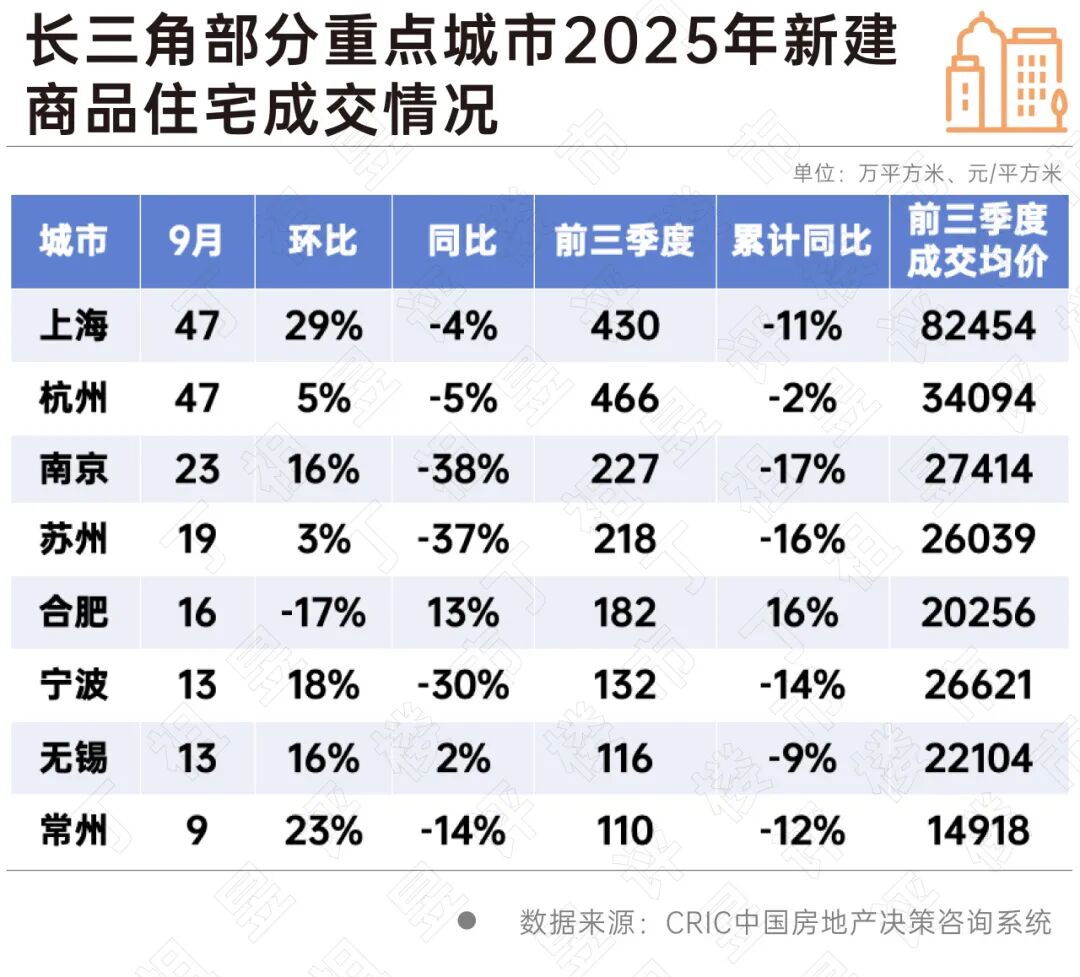 CRIC数据显示,2025年前三季度长三角43个城市商品住宅成交面积达3209.04万平方米,较2024年同期微降5%,好于百城数据。