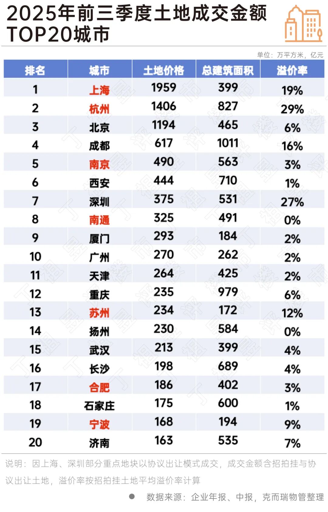 CRIC数据显示,2025年前三季度土地成交金额TOP20城市中,长三角占了7个,分别为上海、杭州、南京、南通、苏州、合肥、宁波。这7个城市的累计土地成交金额达4768亿元,约占TOP20城市成交金额总量的50%。