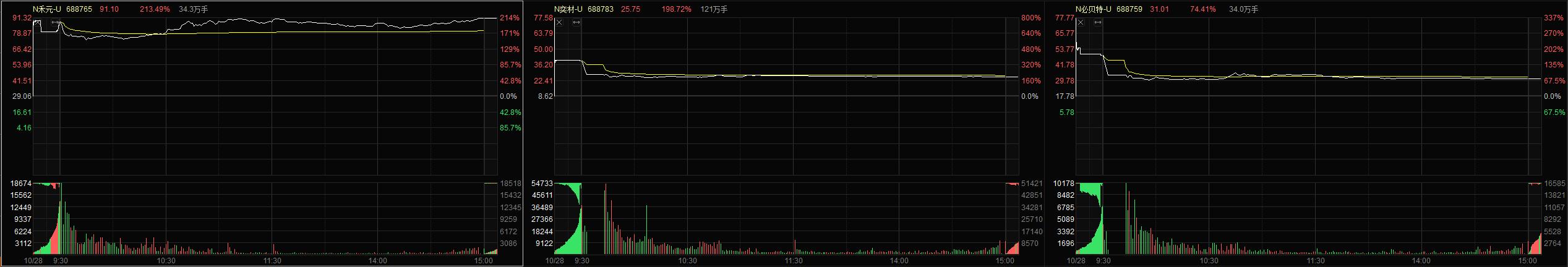上市首日,三家硬科技企业表现优异。截至10月28日收盘,N奕材收涨198.7%,市值1040亿元;N禾元收涨213.49%,市值325.7亿元;N必贝收涨74.41%,市值139.6亿元。