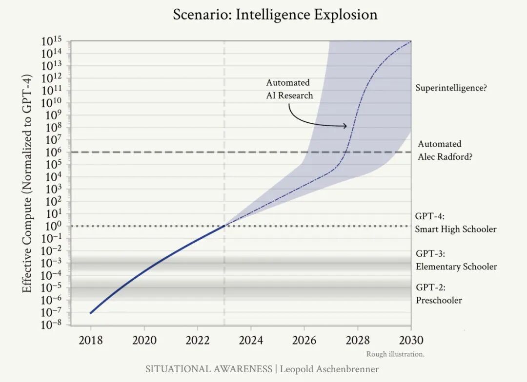 甚至有很多论文都这样说。比如,Leopold Aschenbrenner在论文里提到的那种「一飞冲天」的发展路径。