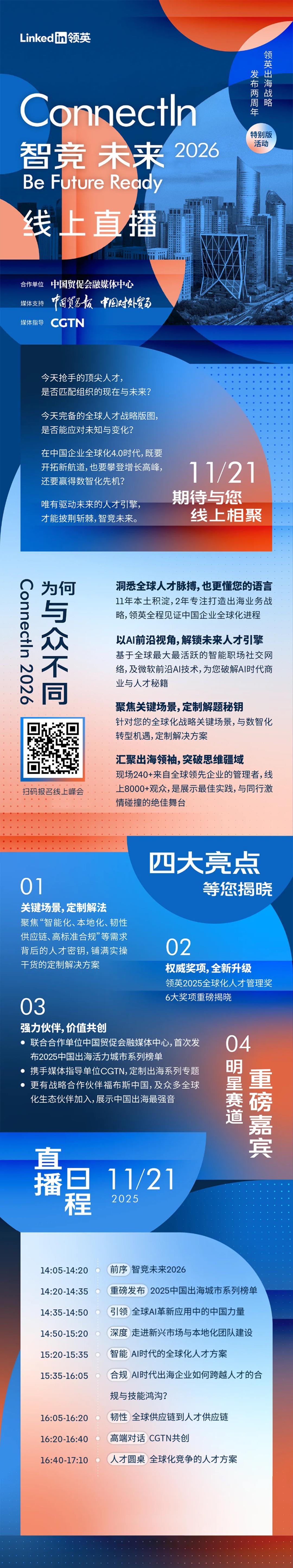 为了帮助中国出海企业更好地在 AI 时代应对全球化人才挑战,领英中国 ConnectIn“智竞·未来”2026 出海峰会将于11月21日在线直播,面向全球化企业的管理层、海外业务负责人、人力资源从业者等,带来可落地的人才策略与操作路径。凭借多年的本土积淀、全球最大最活跃的智能职场社交网络、微软前沿 AI 技术,以及最引人瞩目的明星赛道重磅嘉宾,领英中国将与观众一起,剖析全球化的人才问题,分享方法论、数据洞察和真实案例。