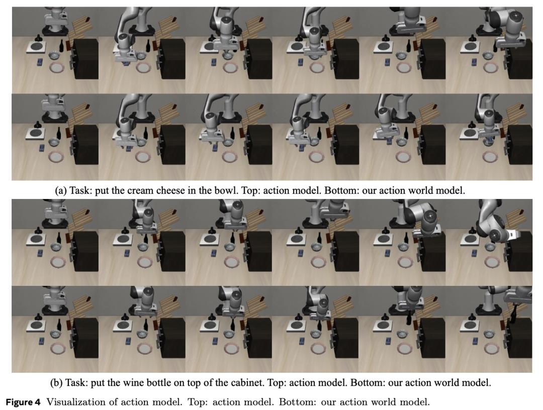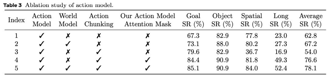 此外,研究还表明引入世界模型能够显著提升动作模型的性能。