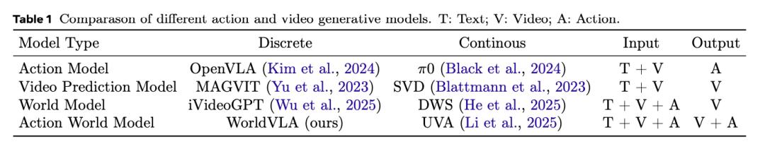 世界模型:能基于当前观测和动作预测未来视觉状态,理解视觉信息与行为动态,但无法直接生成动作,在需明确动作规划的场景中应用受限。