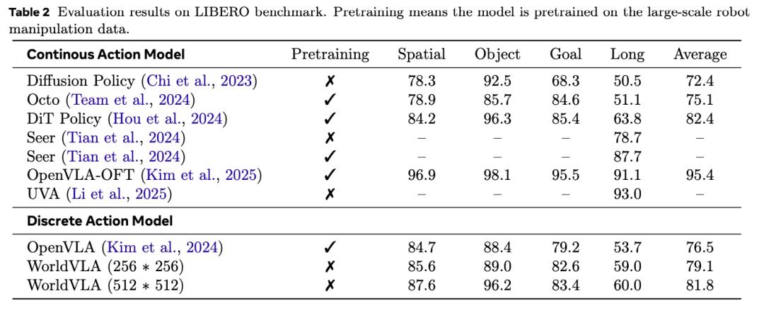 由下表可以看出,即使在没有预训练的情况下,WorldVLA模型也展现出优于离散化OpenVLA模型的性能,这证明了其架构设计的有效性。