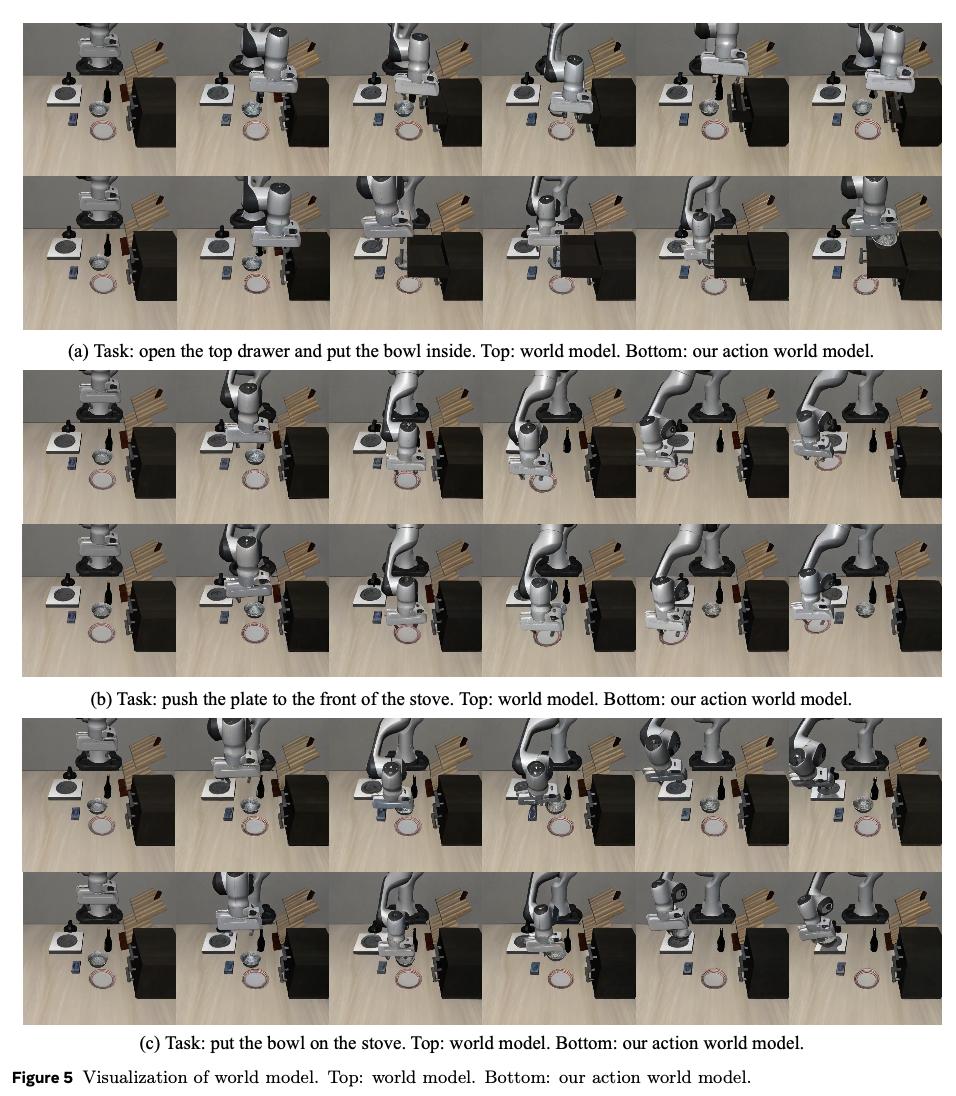 此外,纯世界模型在多个场景中呈现明显缺陷:无法成功拉开抽屉(a)、移动盘子后导致碗消失(b)、未能将碗平稳放置在灶台上(c)。而动作世界模型在这些场景中均生成了连贯且符合物理规律的后续状态。