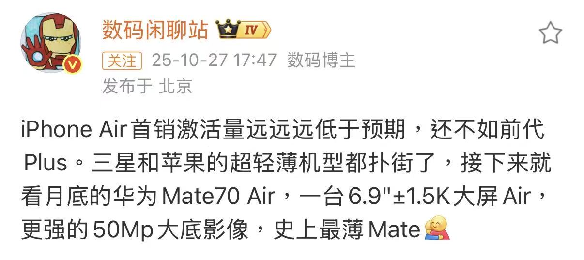 除苹果外,国内TOP5手机大厂也在积极加入到「Air」大战中。近期,华为Mate 70 Air线下海报在互联网曝光,暗示华为Mate系列首款轻薄旗舰11月登场;小米正在评估17 Air新机,主打中尺寸、高像素全能方案。不仅如此,OPPO、vivo、荣耀也有相关的计划。