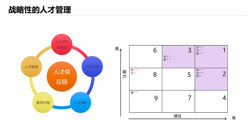 这个九宫格的核心评估维度很简单,一边是“能力”,一边是“绩效”。人才管理本质是构建“良将如云”的人才池,人才供应链是一个“动态循环”——随时盘点身边已有的人,再针对性培养新生代,最终搭建起“AB角”式的人才梯队。