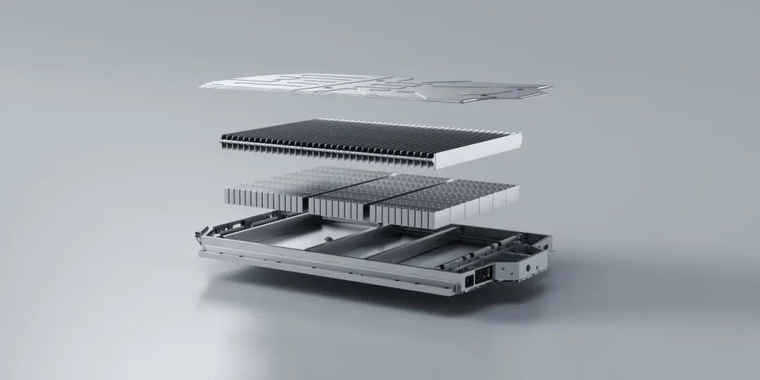 早期的电池包采用电芯、模组、电池包三级结构。比如初代特斯拉 Model S 将 444 颗 18650 圆柱电芯串、并联后集成在 1 个模组里,每个模组配备独立的 BMS(Battery Management System,电池管理系统)和冷却管路。一个电池包能装 16 个模组,内部填充防火材料,外部连接整车的高压系统。大量空间被结构件和冷却管路占据。