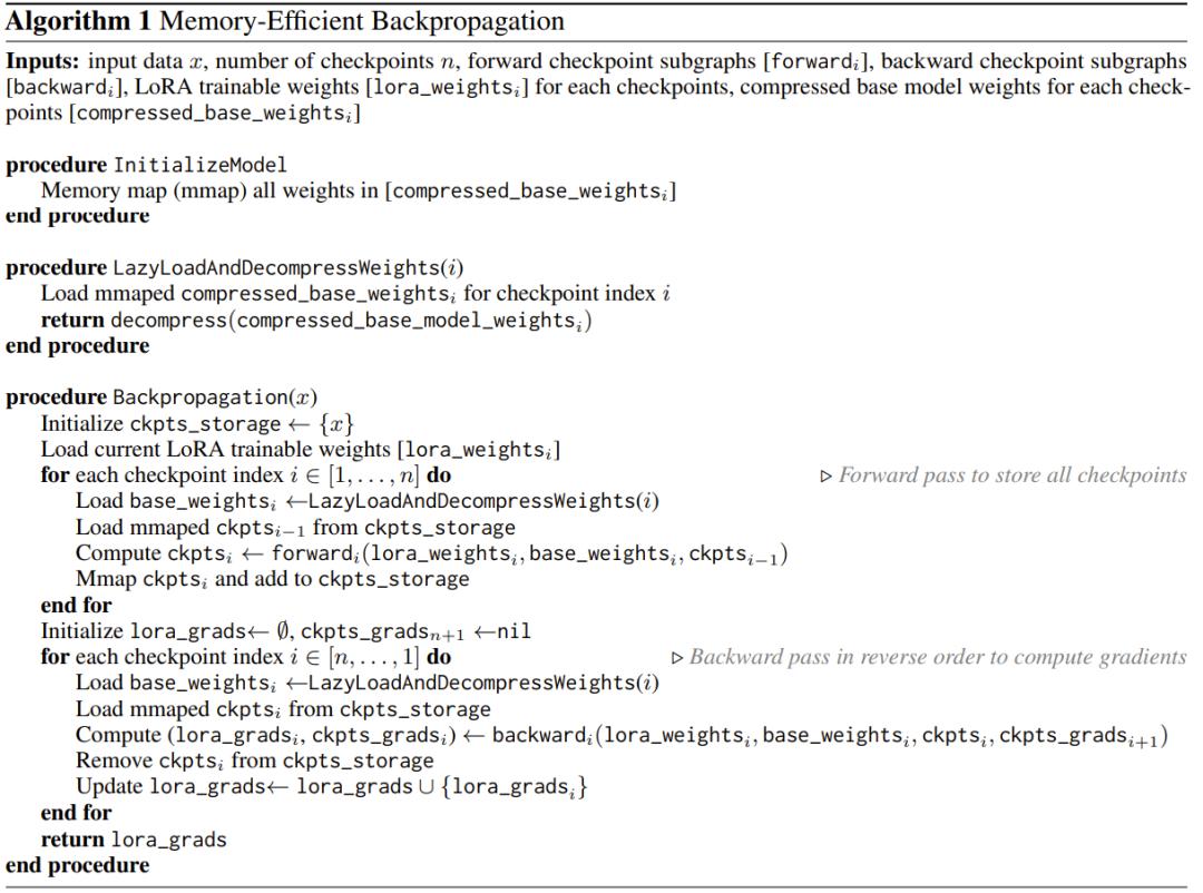 模型首先使用 InitializeModel 函数进行初始化,之后训练循环中的每个数据点都会调用 Backpropagation 函数。在 InitializeModel 期间,压缩后的基础模型权重被内存映射(memory-mapped)。为最小化内存占用,基础模型权重在训练循环开始前不会被解压。相反,它们会在计算需要时才被按需(on demand)延迟解压和加载。注意,对于支持使用量化权重进行计算的设备运行时框架,解压步骤可以被跳过,届时只需按需加载压缩后的权重。