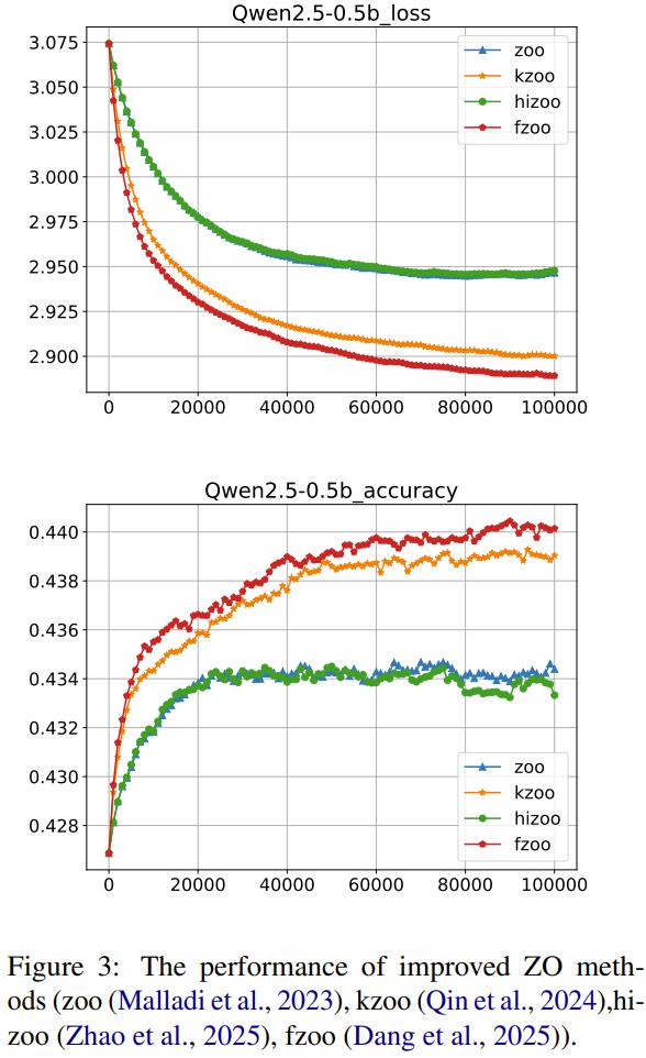 目前 AI 社区已经提出了几种方法,可以改善 ZO 方法的收敛速度。该团队也在 Qwen2.5-0.5B 上使用了这些改进版 ZO 方法进行实验,结果见下图。