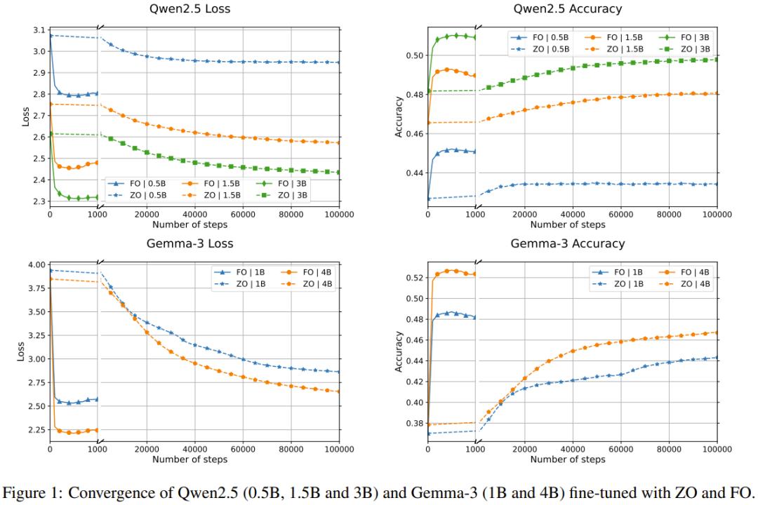 配置上,这个苹果团队使用了 Gemma-3 和 Qwen-2.5,在 WikiText-2 数据集上进行语言建模任务实验,以此比较一阶(FO)优化(即通过反向传播获得梯度)和零阶(ZO)优化的效用。该团队专注于参数量不超过 4B 的模型,因为移动设备的计算资源有限。该团队的评估指标是评估集上的损失(loss)和下一 token 准确度。其它配置见原论文,下面重点关注结果。