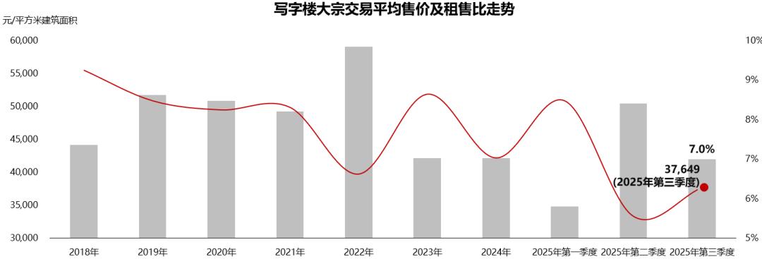 尽管市场整体活跃度偏低,本季度写字楼平均售价环比上升13%至37649元/平方米建筑面积,租售比下降至7.0%。该价格波动主要由个别高单价交易驱动,如东城区朝内大街199号华富商贸大厦以约4亿元、单价超70000元/平方米建筑面积成交,反映稀缺区位优质资产仍具备较强的价值韧性。