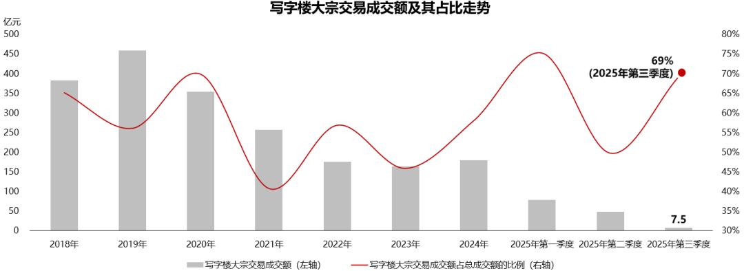 2025年第三季度,北京写字楼大宗交易市场活跃度处于低位,全季度共录得四宗交易。为保持统计口径统一(聚焦于股权及资产交易),核心数据分析未纳入其中的两宗债权交易。市场数据呈现显著的结构性分化:写字楼大宗交易总额环比大幅下滑84%至7.5亿元,反映出在资金面持续收紧的背景下,收购方的决策更为审慎;然而,写字楼业态在大宗交易总金额中的占比却逆势上升近20个百分点,达到69%,凸显出核心区位写字楼作为具备防御价值的抗周期资产,依然能获得资本的认可。