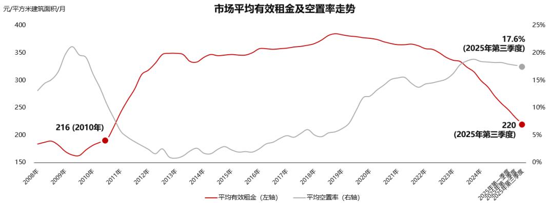 2025年第三季度,北京甲级写字楼市场延续调整态势,平均有效租金环比下降5.0%至220元/平方米建筑面积/月,回落至与2010年相近的水平。空置率为17.6%,较上季度微降0.1个百分点,去化压力依然显著。