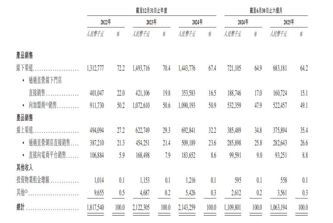 以2025年上半年为例,通过向加盟门店销售产品创造的收入为5.2亿元,超过线下直营店收入的3倍,占整体收入的49.1%。