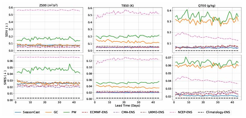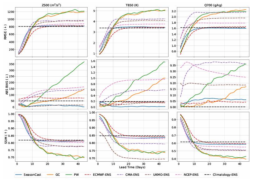 首先在 S2S 天气预测任务中,研究人员将 OmniCast 与 PanguWeather(PW)和 GraphCast(GC)在内的两个深度学习方法,以及UKMO-ENS(英国)、NCEP-ENS(美国)、CMA-ENS(中国)和 ECMWF-ENS(欧洲)四个国家及地区的数值模型集合系统进行了比较。