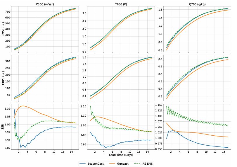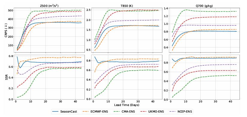 之后在中期天气预测任务中,研究团队将 OmniCast 与用于概率性预报的主流深度学习方法 Gencast 和数值集合预报系统的「黄金标准」——IFS-ENS 这两类基准模型进行了对比,以 RMSE、CRPS 和 SSR 作为评估指标。如下图所示: