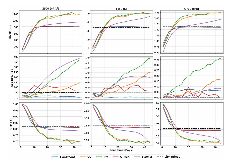 在准确性指标(均方根误差(RMSE)、绝对偏差(ABS BIAS)和多尺度结构相似相(SSIM))方面,OmniCast 在短期预报时效内的 RMSE 和 SSIM 上表现都意料之中的略逊于其他基准模型。当然,这是由 OmniCast 的训练目的导致的,但随着预报时效增加,OmniCast 的相对性能会逐步提升,在 10 天后可达到与 ECMWF-ENS 相当的最优表现。如下图所示: