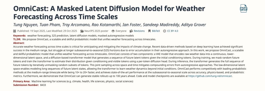 相关研究以「OmniCast: A Masked Latent Diffusion Model for Weather Forecasting Across Time Scales」为题,入选 AI 顶级学术会议 NeurIPS 2025。