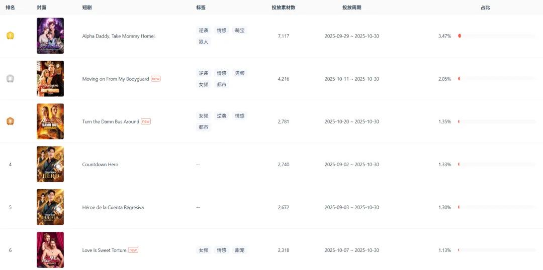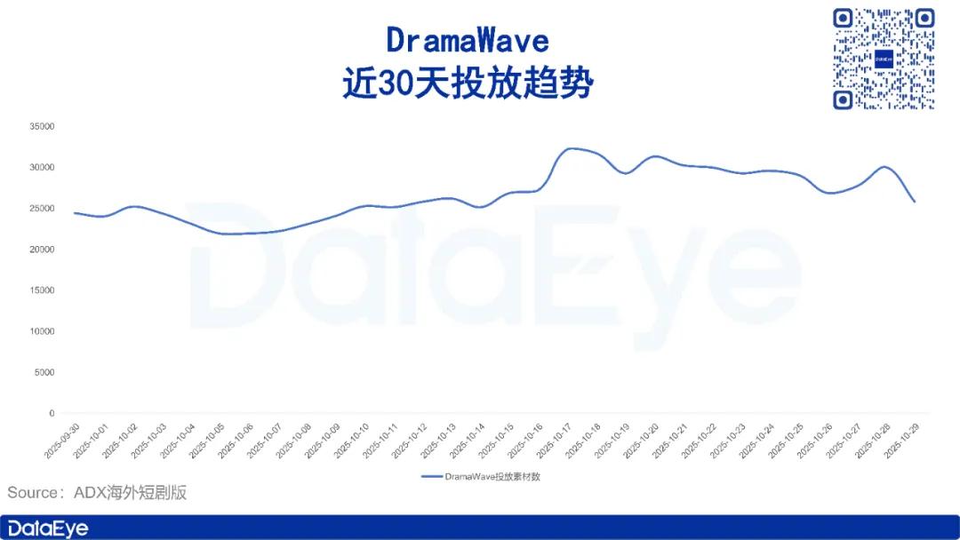 在投放力度上,近30天,DramaWave投放力度呈上涨趋势,日投放素材量由9月底的2.5万组左右上涨至10月中旬的3万组左右,并持续至今。