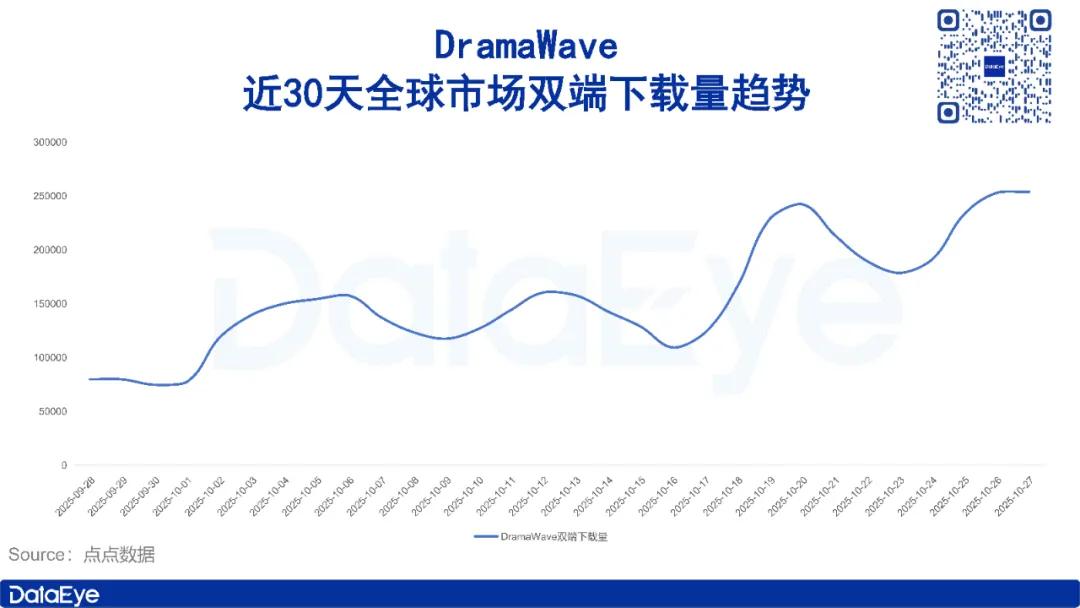 在下载量方面,近30天DramaWave全球市场双端预估下载量呈震荡上升趋势。日预估下载量由9月底的8万次左右上升至近期的25万次左右,涨幅超200%。