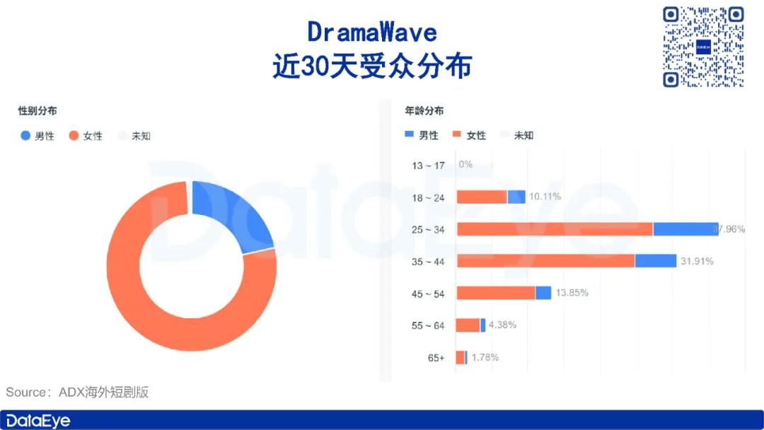 在受众分布上,近30天DramaWave以女性用户为主,占比77.59%,男性用户占比21.5%。