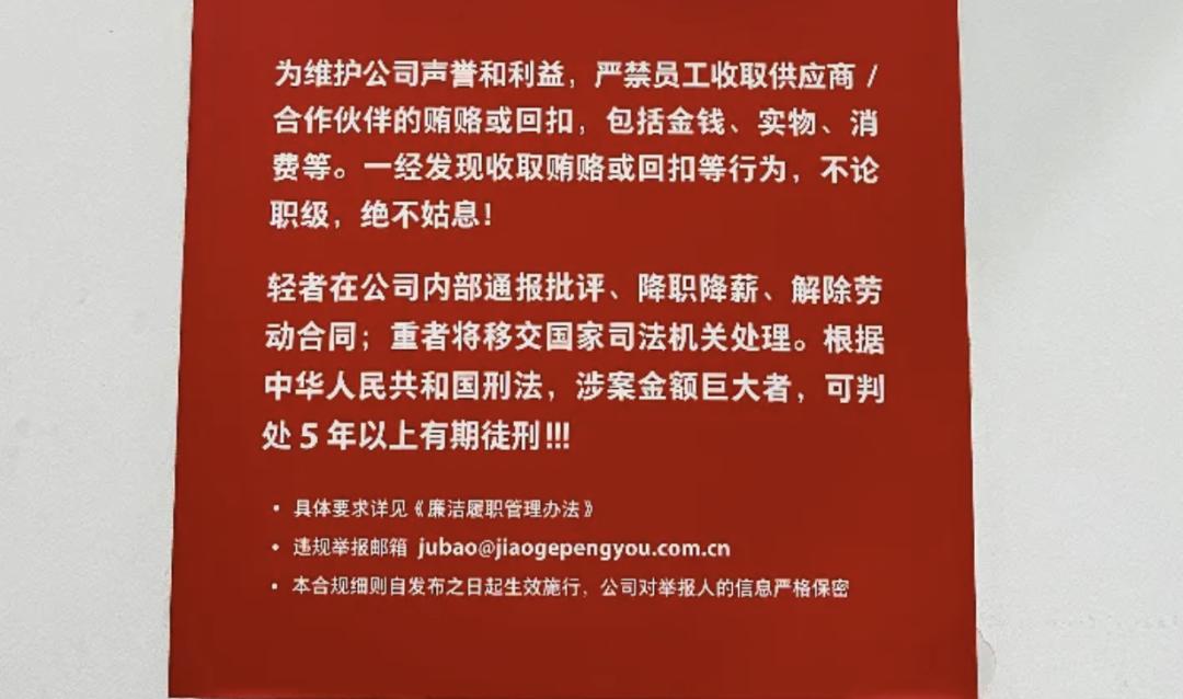 交个朋友也有相应措施。有接近交个朋友的人士介绍,交个朋友会对员工进行定期廉洁教育;其次,开通举报邮箱,对于查实的举报给与奖励,并严格保护隐私。最后,对内通报查处的反腐典型案例。