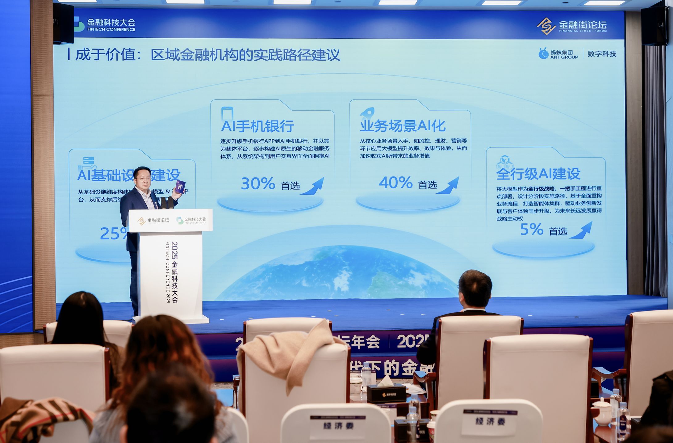 图:蚂蚁数科AI业务总裁余滨在金融街论坛分享《跨越价值鸿沟:金融AI创新应用的成果交付新路径》