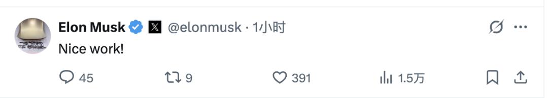 马斯克也认为这个成绩可喜可贺,称赞了一句Nice work。