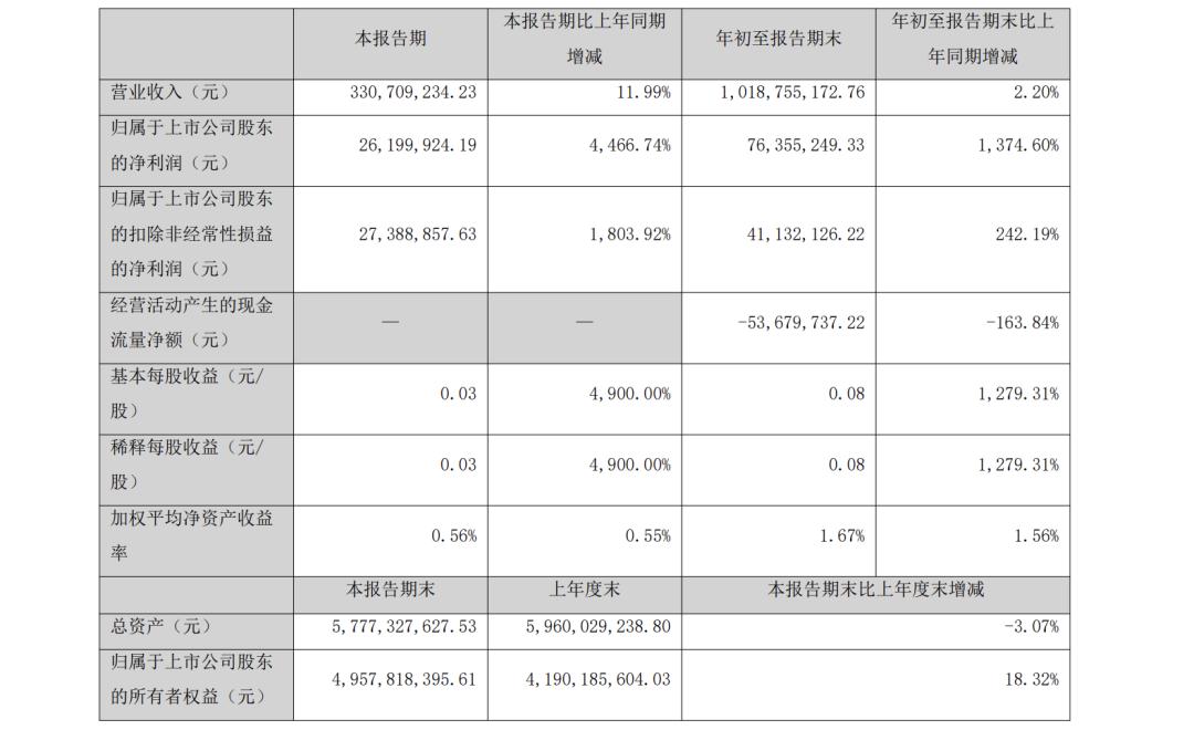 报告显示,公司前三季度实现营业收入10.19亿元,同比增长2.20%,归属于上市公司股东的扣除非经常性损益的净利润0.4亿元,同比增长242.19%。