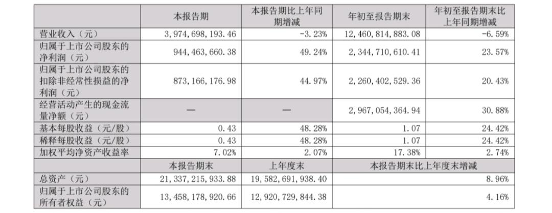 三七互娱第三季度虽然营业收入同比下降了3.23%,为39.75亿元,但净利润达到了9.44亿元,同比大幅增长49.24%。前三季度营业收入达到124.61亿元,同比减少6.59%,净利润达到23.45亿元,同比增长23.57%。