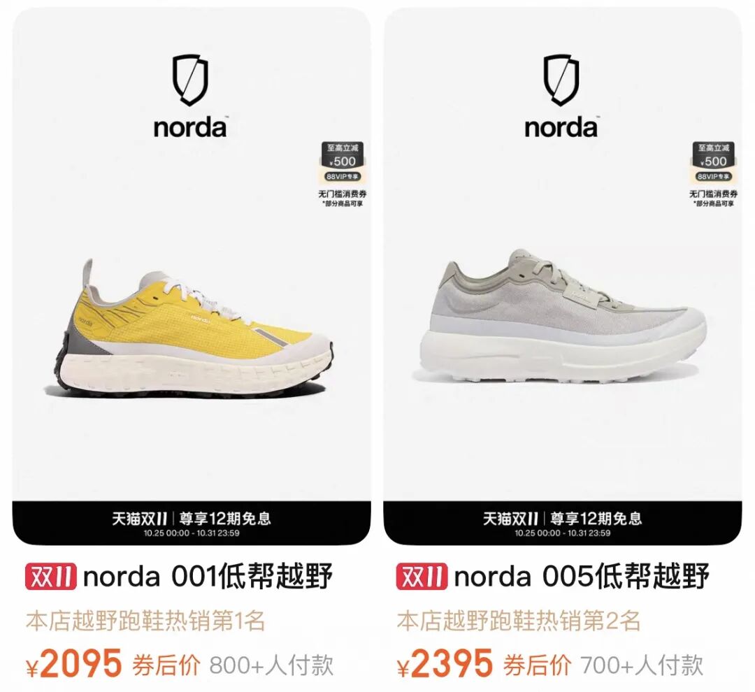 而纵观国内市场的价格,人们普遍愿意为切实的科技、性能买单,如果颜值「抗打」那么价格更有想象空间。入门级至中端价格区间集中在500-1000元之间,中高端越野跑鞋千元起步已是常态。如前文提到的Norda,最新迭代的001A鞋款搭载专利Arnitel® TPEE中底,甚至能够卖出2000+的价格。