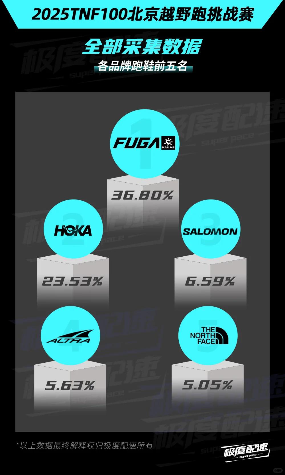 以今年九月TNF100赛后,极度配速对1876名跑者的参赛鞋款进行的数据统计为例,国际跑鞋56.09%和国产跑鞋43.91%的占比可谓实力相当。而其中,凯乐石FUGA独占36.8%,HOKA、SALOMON、ALTRA、TNF分去40.79%占比,都不难看出各家运动品牌的激烈战况。