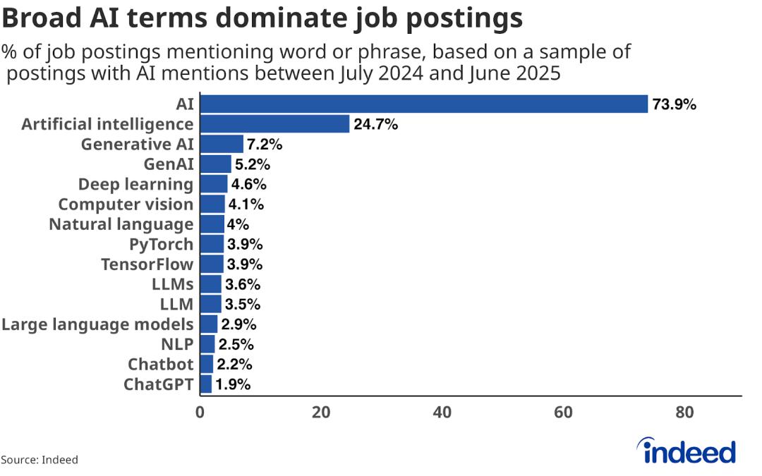 2024 年 7 月至 2025 年 6 月,人工智能相关职位招聘信息中最常用的 15 个关键词,AI 占主要地位,而不是某项具体 AI 技能,如计算机视觉、自然语言处理等