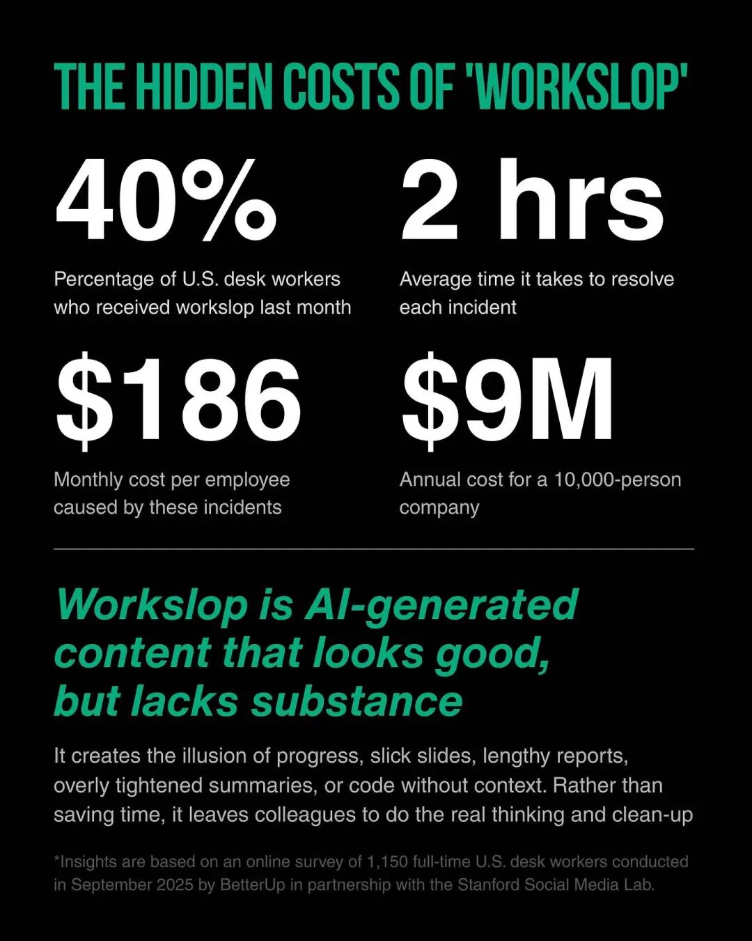 AI 生成的工作废料,像是幻灯片、摘要、代码等,需要人类花更多的时间和精力去处理。有调查发现,AI 参与后有 40% 都是工作垃圾,每一份垃圾要浪费员工两个小时,186 美元。